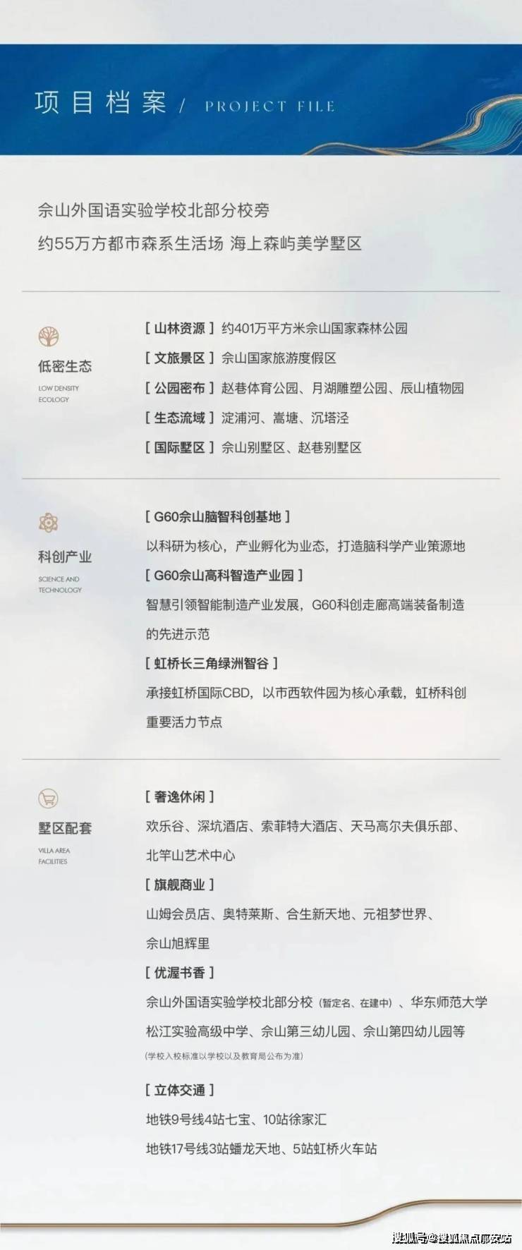 项目半径3公里内汇聚了佘山国际高尔夫俱乐部、洲际深坑酒店、月湖雕塑公园等顶奢休闲资本,从铝板玻璃幕墙立面到LOW - E玻璃材质,依托“四纵三横”网,畅达城市每一个角落。